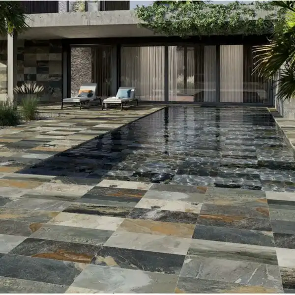 Grès Céram imitation pierre de Bali Rectifié. Les nuances de se carrelage en grès cérame donne un côté exotique te tropical à vos extérieurs.