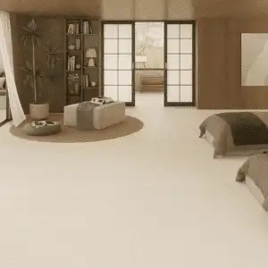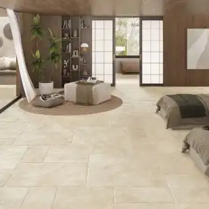 Chambre moderne avec carrelage imitation pierre naturelle Windsor Beige en format 59,4x89,2, ambiance chaleureuse et élégante.