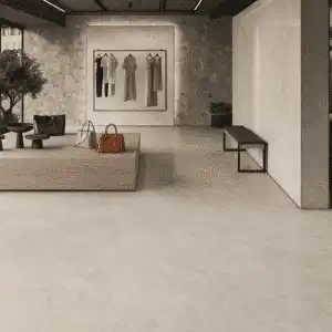 Mise en situation du carrelage imitation pierre naturelle 60x120 Sorrento Sabbia rectifié dans une boutique moderne au sol brillant