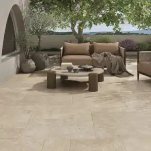 Terrasse extérieure avec le carrelage imitation pierre naturelle Provence Beige 59,4x89,2, créant une ambiance chaleureuse et élégante.