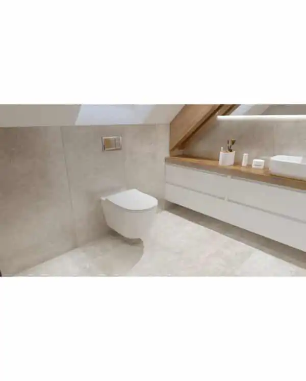 Suspendue au mur, elle libère l’espace au sol et s’intègre parfaitement dans des toilettes ou une salle de bain modernes.