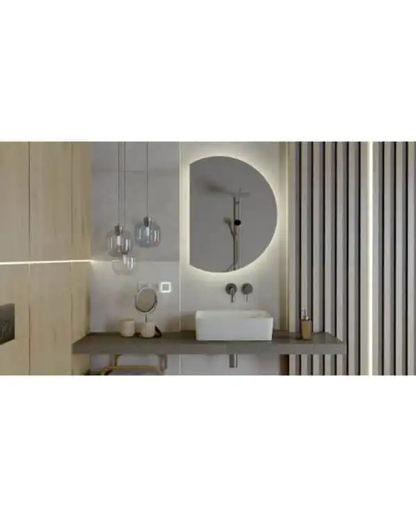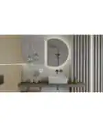 Le miroir lumineux Laso apporte une touche contemporaine à la salle de bain grâce à son design demi-rond et son éclairage LED intégré.